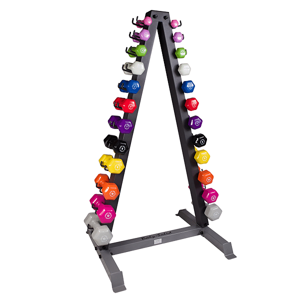 Holds 12 pairs of vinyl or neoprene dumbbells
