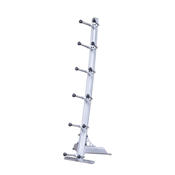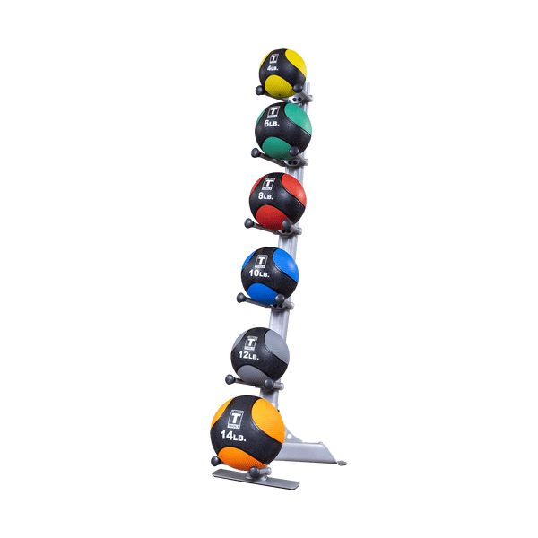 The new Body Solid medicine ball rack GMR10 provides quality storage and design for just about any size medicine ball or dual grip medicine ball. The GMR10 provides vertical storage for up to 6 medicine balls or 6 dual grip medicine balls. The rack fits medicine balls from 2lbs to 16 lbs and dual grip medicine balls from 6lbs to 20lbs. The curved oval upright allows for easy access to every tier. Heavy gauge steel provides a stable and durable frame. The silver powder coat finish and modern look shows off your accessories in style. At only 21” x 22” foot print, the GMR10 is compact and functional. Medicine balls sold separately.