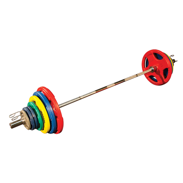 ORC400S Colored Rubber Grip Oly Set 400lbs Includes: (6) 45lb. (2) 35lb. (2) 25lb. (4) 10lb. (4) 5lb. (2) 2.5 lb. plates (1) 7 ft. – 45 Lb. Chrome Olympic Bar OB86 (2) Olympic Spring Collars OC06