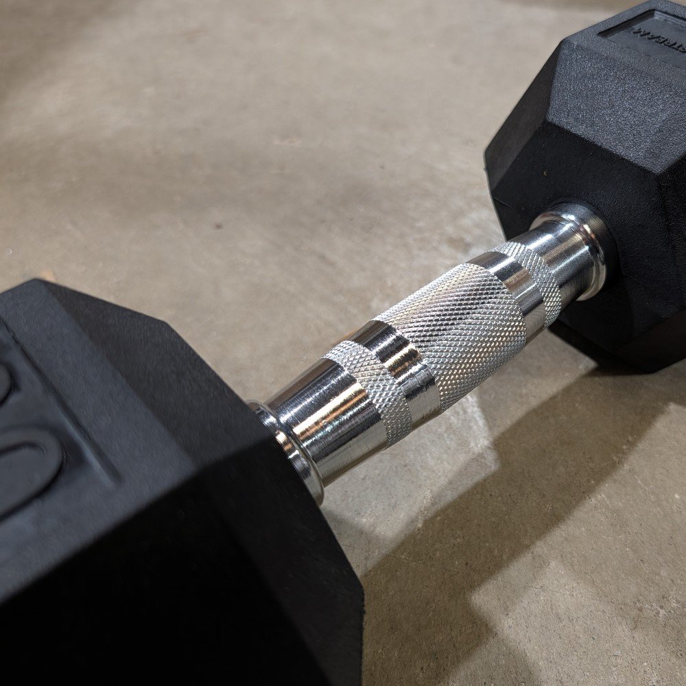Weights up to 150 pounds. Comfortable grip in any position. Ergonomic handles provide a firm and comfortable grip on both the dumbbells and the floor, while chrome-plated heads reduce noise, wear, and durability. The heavy-duty rubber is an economical option that yet gives quality and performance. The usual rubber hex design is superb.